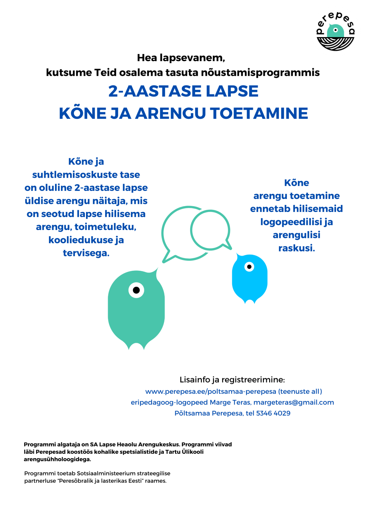 Loe rohkem ja registreeru: https://www.perepesa.ee/poltsamaa-perepesa/teenused/2-aastase-lapse-kone-ja-arengu-toetamine