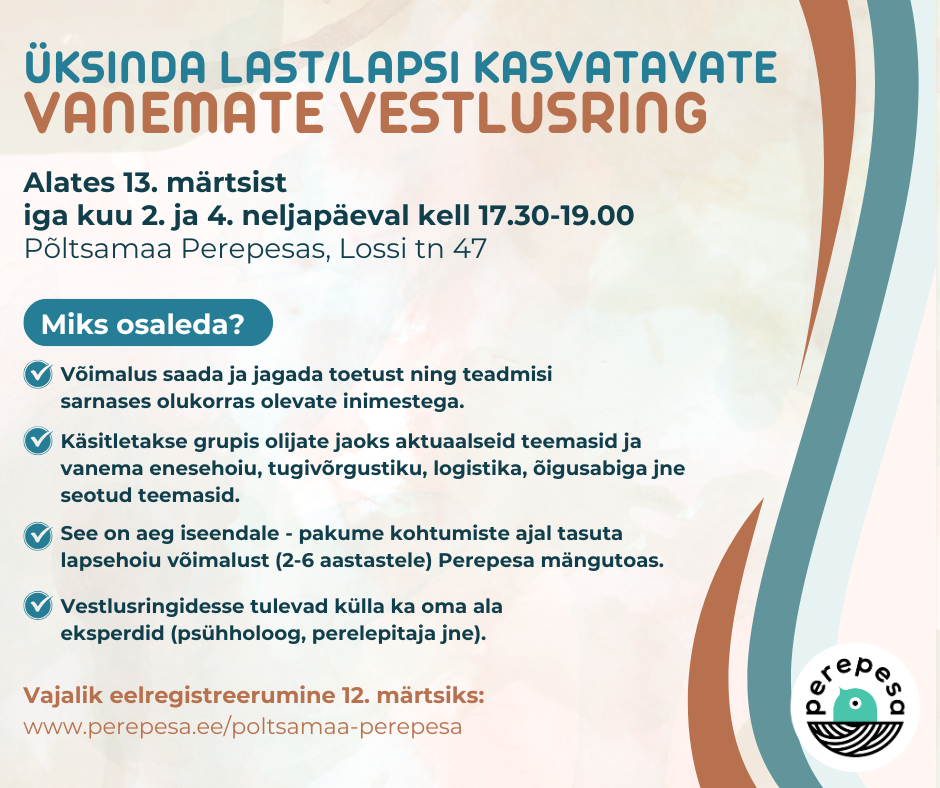 Ootame Sind, kes Sa oma last/lapsi üksinda kasvatad, vanemate vestlusring alates 13. märtsist 2025 iga kuu 2. ja 4. neljapäeval kell 17.30-19.00 Põltsamaa Perepessa.