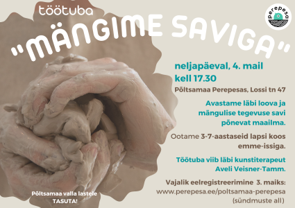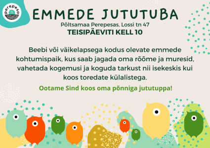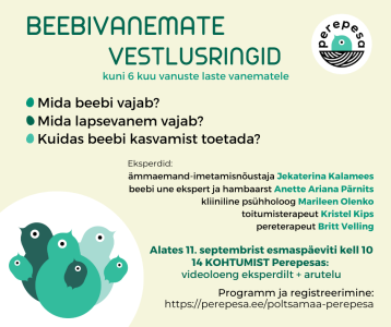 "Ohoo, mis see Montessori on?" Jututuba lapsega kodus olevatele emmedele-issidele Alustame beebivanemate vestlusringidega Perepesa mängutuba on alates 28. augustist jälle avatud Perepesa lahtiolek suvekuudel 21. mail toimub Papside klubi väljasõit 4. mail toimub töötuba "Mängime saviga" 3-7-aastastele lastele Ootame emmesid-issisid jututuppa Tagasi 3 / 13 lehest (kokku 100 uudist) Edasi