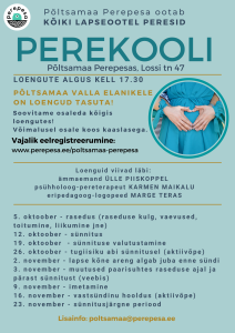 5. oktoobril alustab järjekordne Perekool lapseootel olijatele Riik pakub nüüdsest tasuta perelepitusteenust lahutanud või lahutavatele vanematele Perepesas alustab septembrist PAPSIDE KLUBI Mängutuba on suletud 20. juuni - 14. august Muusikatunnid Sille krooniga 27. aprillil Lõpetas järjekordne vanemlusprogrammi "Imelised aastad" grupp Alustame taas ema-lapse võimlemisega Alustab järjekordne Perekool Tagasi 4 / 13 lehest (kokku 100 uudist) Edasi