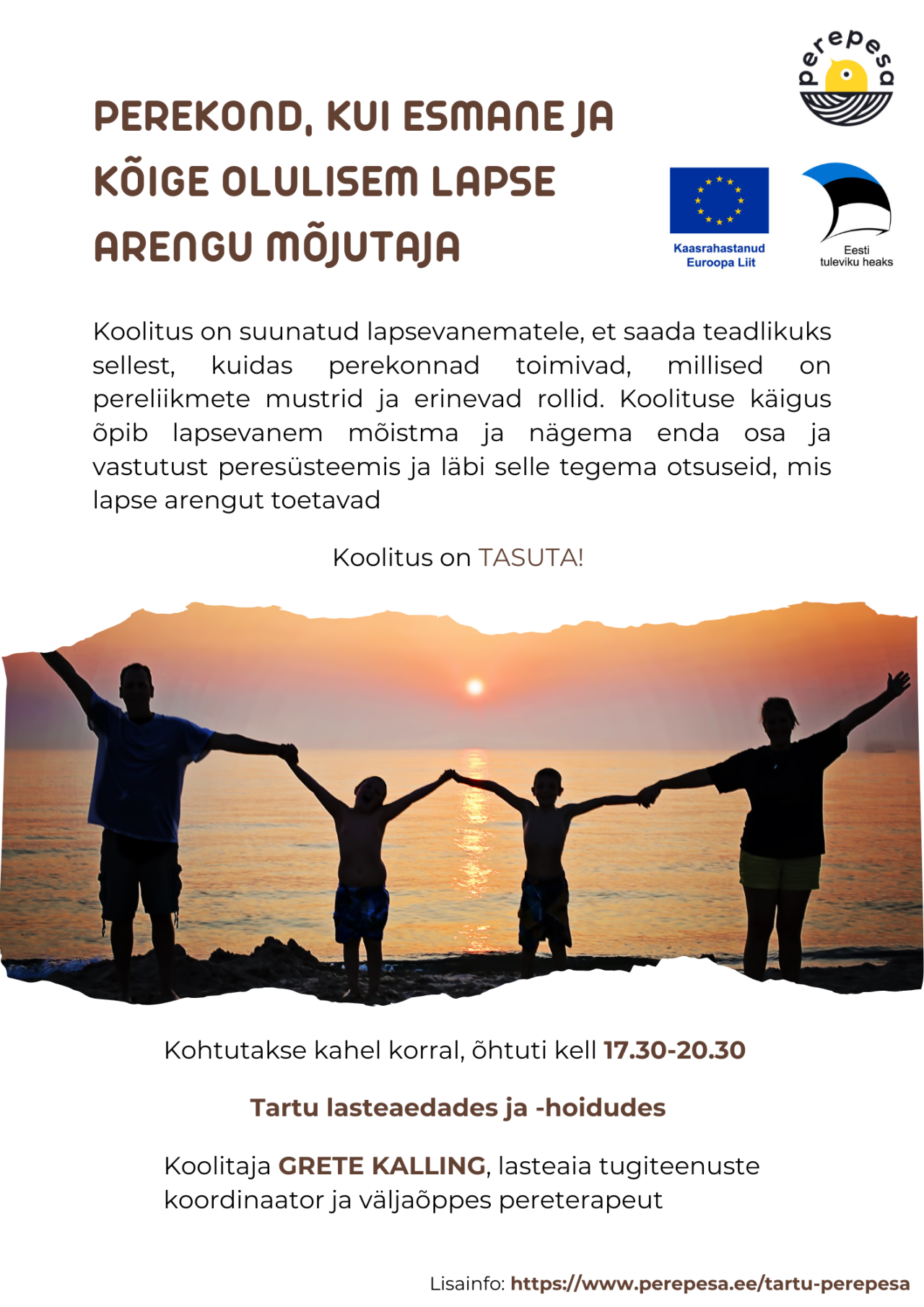 Läbiviija: Grete Kalling - lasteaia tugiteenuste koordinaator ja väljaõppes pereterapeut. “Minu haridustee ja töökogemus on andnud mulle võimaluse näha ja mõista lapsi erinevates süsteemides: haridus- sotsiaal- ning peresüsteem. Olen töötanud pikalt laste ja noortega ning fookus on olnud omavahelistel suhetel ja last toetaval keskkonnal. Viimastel aastatel on olnud minu fookus eelkõige peresüsteemil ja peresisestel suhetel ning kodusel keskkonnal, mis võib olla lapse arengut toetav või kahjustav. Olen veendunud, et laste toetamine saab olla palju jätkusuutlikum ja tõhusam kui toetada tervet perekonda. Olen väljaõppes pereterapeut ning oma nõustamistöös ja koolitustel tuginen ma perekonnapsühhoteraapia põhimõtetele.”