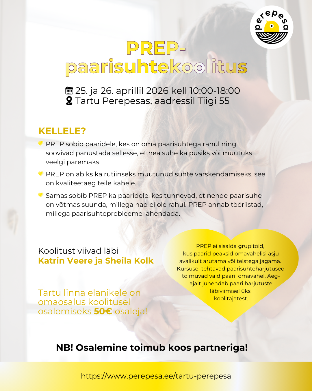 2-päevane PREP-paarisuhtekoolitus toimub 25. ja 26. aprillil 2026 kell 10.00-18.00 Tartu Perepesas, aadressil Tiigi 55.