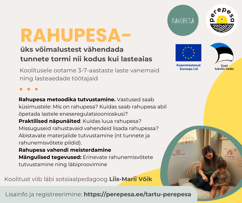Rahupesade põhimõtete ja rahunemisvõtete tutvustus ning ühe rahupesa vahendi valmistamine. Kui lasteaias juba kasutatakse rahupesasid, siis on pärast koolitust võimalik tutvuda rahupesadega rühmaruumides.