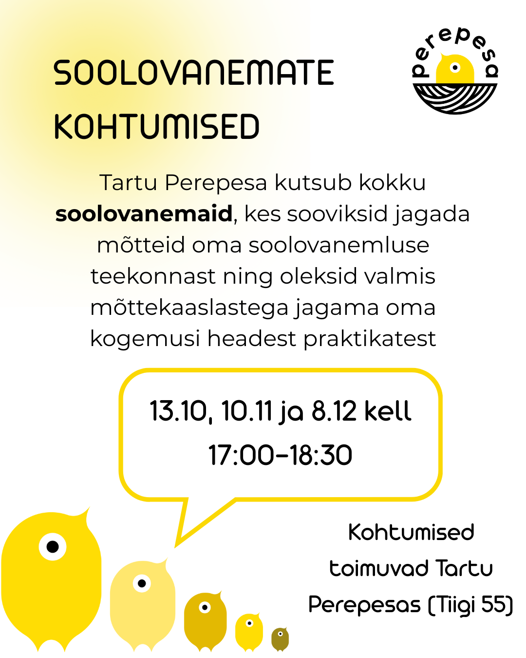 Tartu Perepesa kutsub kokku soolovanemaid, kes sooviksid jagada mõtteid oma soolovanemluse teekonnast ning oleksid valmis mõttekaaslastega jagama oma kogemusi headest praktikatest.