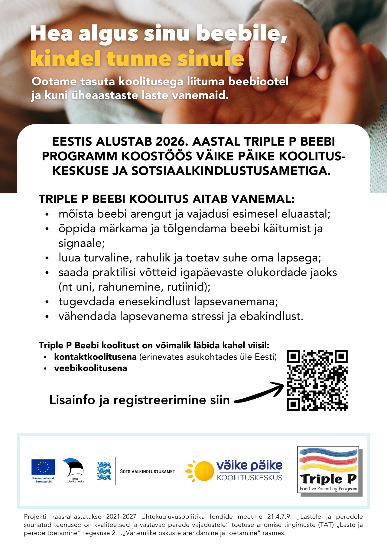 Triple P ehk Positiivse Vanemlusprogrammi Beebi koolitus aitab vanematel luua tugeva ja positiivse suhte oma lapsega ning toetada tema arengut juba esimestest elukuudest. Osalejad saavad praktilisi oskusi ja nippe, mis aitavad lapsevanematel end enesekindlamalt tunda ning olla valmis igapäevaelu väljakutseteks.