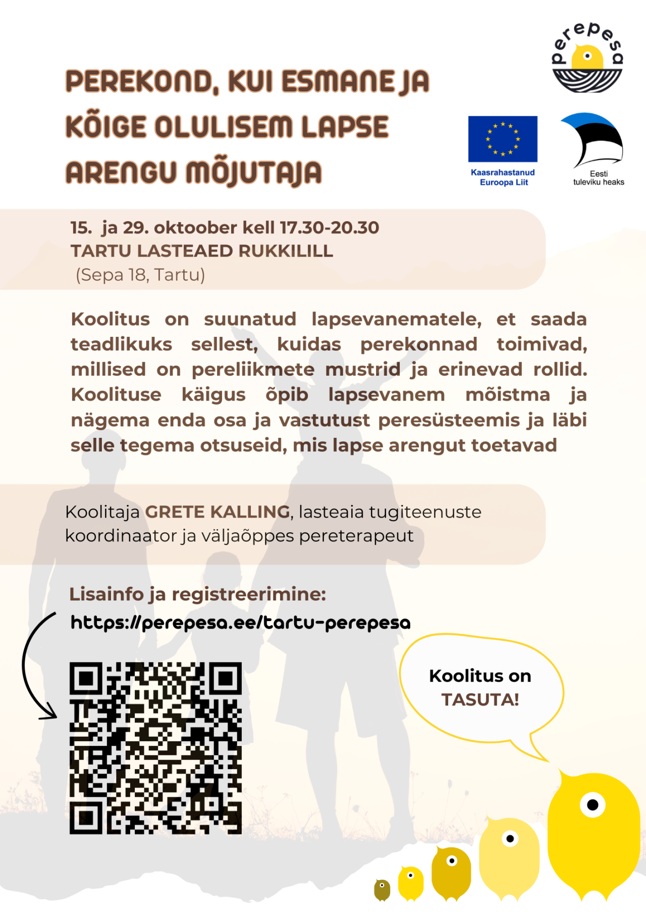 Maksumus: TASUTA (koolitus on rahastatud Sotsiaalministeeriumi ''Kohalikes omavalitsustes pereteenuste loomise ja arendamise'' toetuse kaudu)