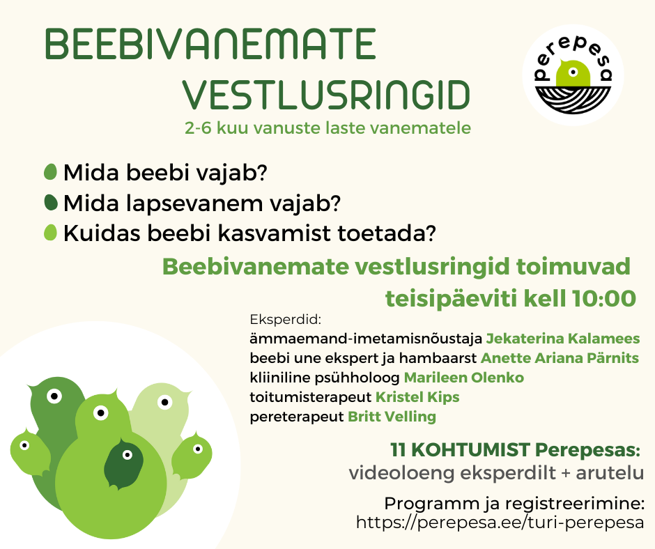 Kui perre sünnib beebi, algab uus ja põnev teekond täis rõõme, küsimusi ja vahel ka kahtlusi. Selleks, et vanemad tunneksid end kindlamalt, ootab Türi Perepesa kõiki värskeid lapsevanemaid beebivanemate vestlusringidesse.
