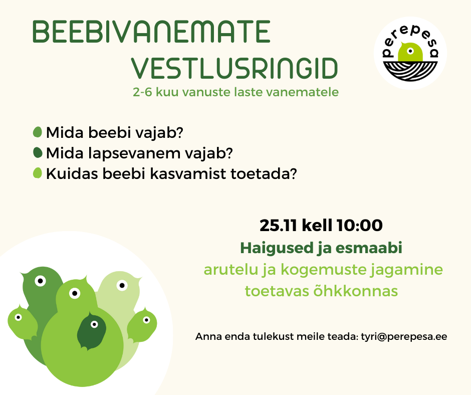 BEEBIVANEMATE VESTLUSRING 25.11 kell 10:00 Haigused ja esmaabi Broneeri Jäta tagasiside 25.11 kell 10:00 Haigused ja esmaabi