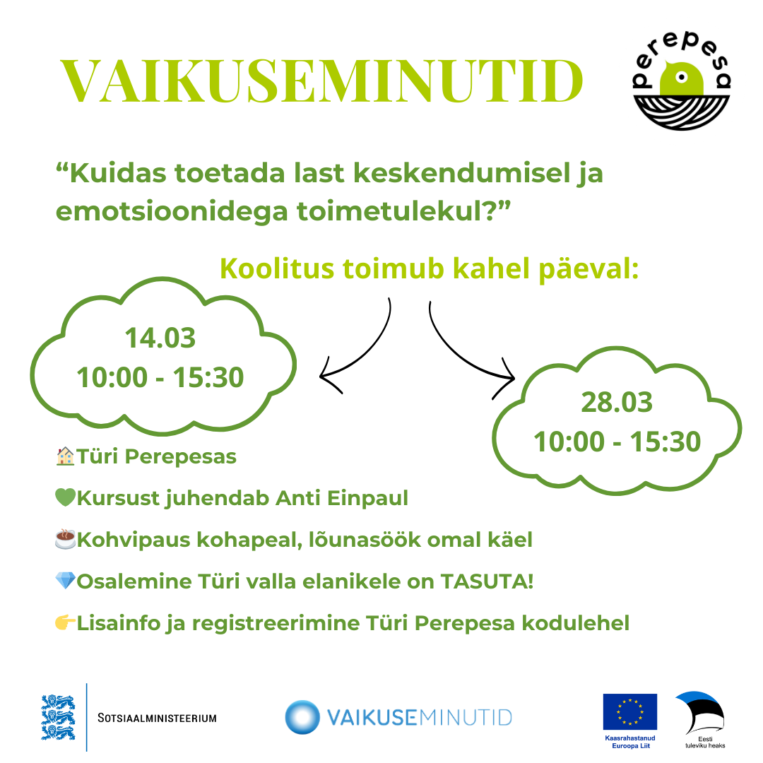 Kahepäevane Vaikuseminutite kursus Türi Perepesas 14.03 ja 28.03