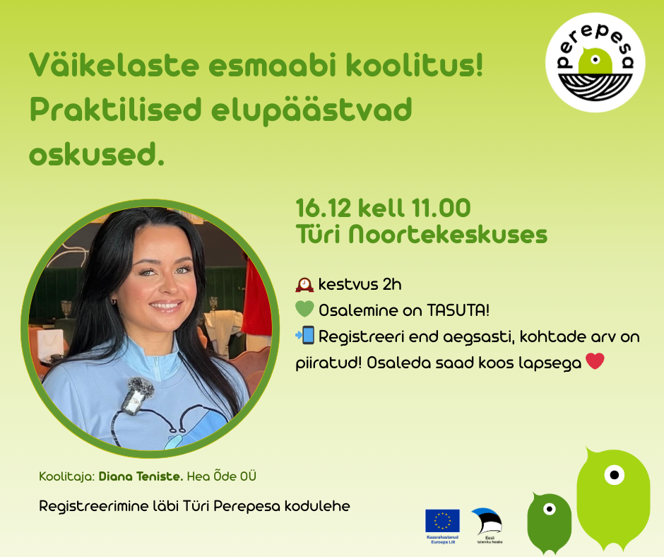 Väikelaste esmaabi koolitus! Praktilised elupäästvad oskused. 16.12 kell 11.00 Türi Noortekeskuses