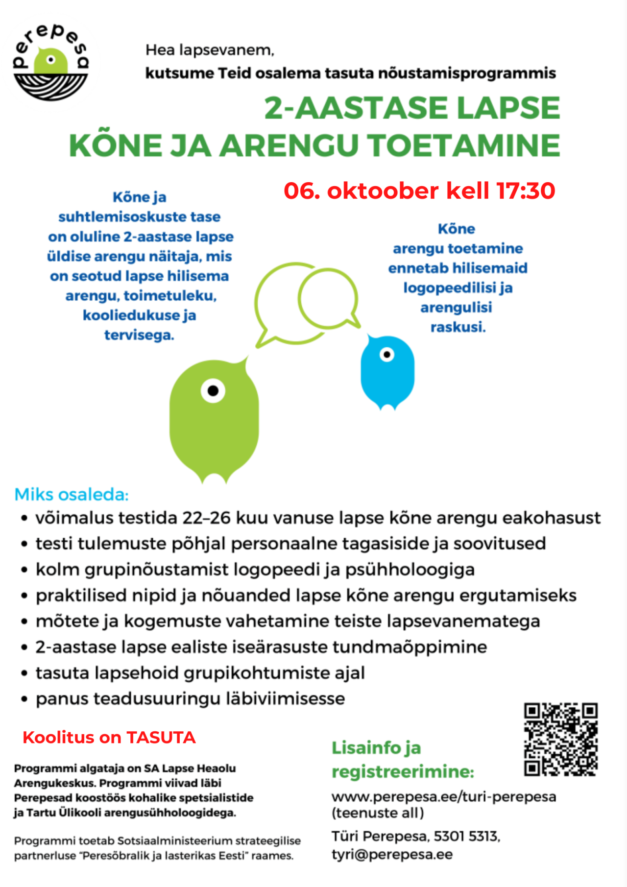 Türi Perepesa kutsub peresid osalema programmis „2-aastase lapse kõne ja arengu toetamine“, kus lapsevanemad saavad teadmisi, praktilisi nippe ja personaalset tuge oma lapse arengu toetamiseks.