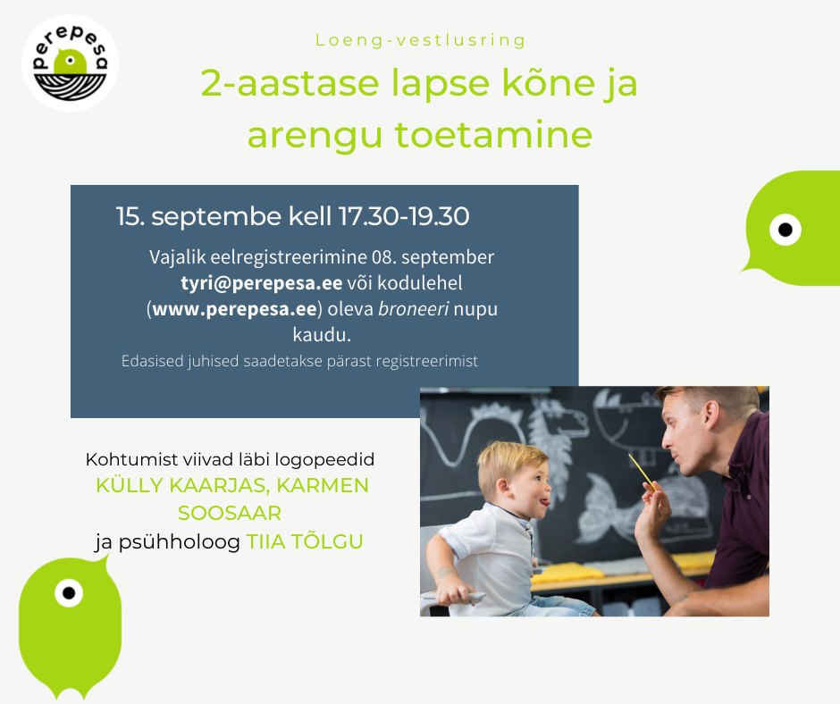 2-aastane laps on juba osav toimetaja ja tema kõne areneb pidevalt ning lapsevanemal on võimalik tema arengule oskuslikult kaasa aidata. Kui Sinu laps on saanud või saamas 2-aastaseks, siis ootame Sind koolitusele! Anname Sulle häid soovitusi ja võimalust spetsialistide ning teiste lastevanematega arutada, kuidas oma lapse kõnele ja arengule teadlikumalt tähelepanu pöörata ning seda toetada.