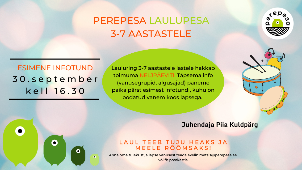 Kutsume Laulupessa ka 3-7 aastaseid lauluhuvilisi lapsi. Esimene tutvumistund koos vanemaga toimub 30. septembril kell 16.30.