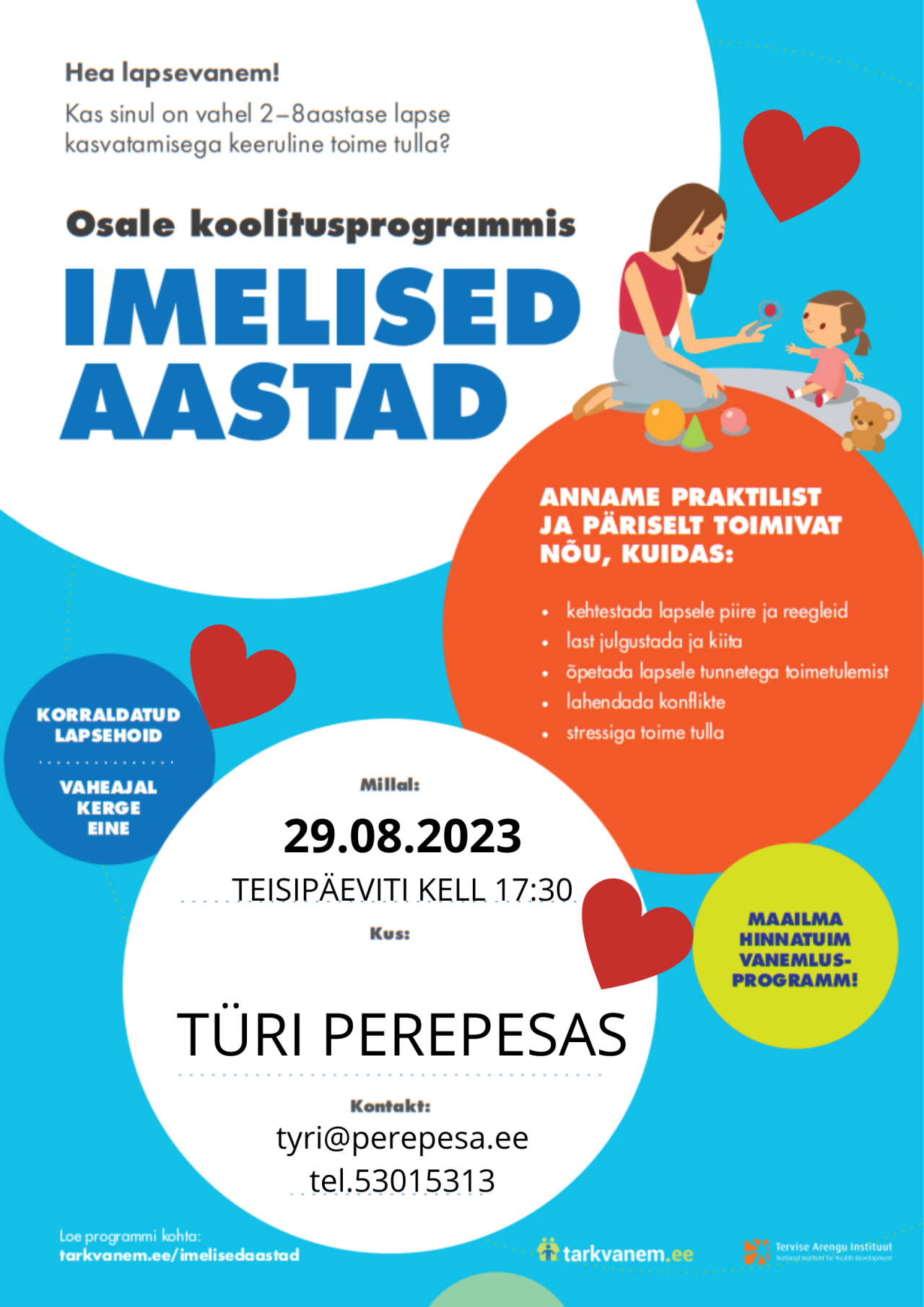 😇Türi Perepesas alustab 29. augustil vanemlusprogramm "Imelised Aastad" koolitus. 💚
