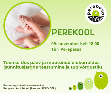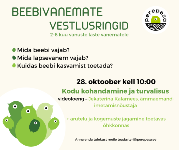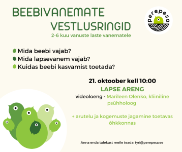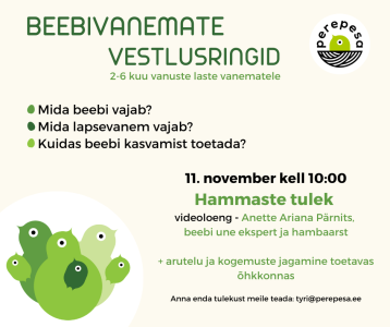 BEEBIVANEMATE VESTLUSRING 11. november kell 10:00 Hammaste tulek PEREKOOL - 05. november kell 18:00 – Uus päev ja muutunud elukorraldus (sünnitusjärgne taastumine ja tugivõrgustik) BEEBIVANEMATE VESTLUSRING 04. november kell 10:00 BEEBI UNI 2-aastase lapse kõne ja arengu toetamine, 03.11 kell 17:30 PEREKOOL - 29. oktoober kell 18:00 – Kuidas olla sünnitusel toeks – südame ja kätega BEEBIVANEMATE VESTLUSRING 28. oktoober kell 10:00 Kodu kohandamine ja turvalisus BEEBIVANEMATE VESTLUSRING - 21.10 kell 10:00 PEREKOOL - 15. oktoober kell 18:00 – Kõhubeebi sünnipäev (ettevalmistus sünnituseks ja tugiisiku roll sünnitusel) Tagasi 2 / 19 lehest (kokku 146 uudist) Edasi
