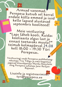 Türi Perepesa septembri toimetused🐥 Meie vestlusring “Laps läheb kooli. Kuidas kooliaasta algus last ja ennast toetavaks muuta?” toimub kolmapäeval 24.08 kell 18.00 – 19.30 Türi Perepesas. Sügisene PEREKOOL alustab 28.09 2022 kell 18.00 Meie armas Perepesa flaier❤️ ❤️Näidis muusikatunnid ja Sillemuusika e-õppe tutvustus Türi Perepesas 26. august Vestlusring “Kuidas toetada lapse lasteaiaga kohanemist?”❤️ 🐥6. septembril algab taas vanemluskoolitus "IMELISED AASTAD"🐥 Mängutuba on sel nädalal avatud: Tagasi 7 / 19 lehest (kokku 146 uudist) Edasi