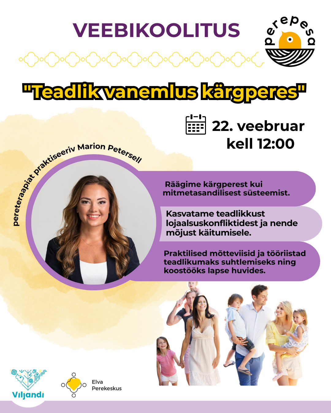 Kutsume Sind pühapäeval, 22. veebruaril, kell 12:00 Elva Perepesa poolt korraldatud veebikoolitusele "Teadlik vanemlus kärgperes".