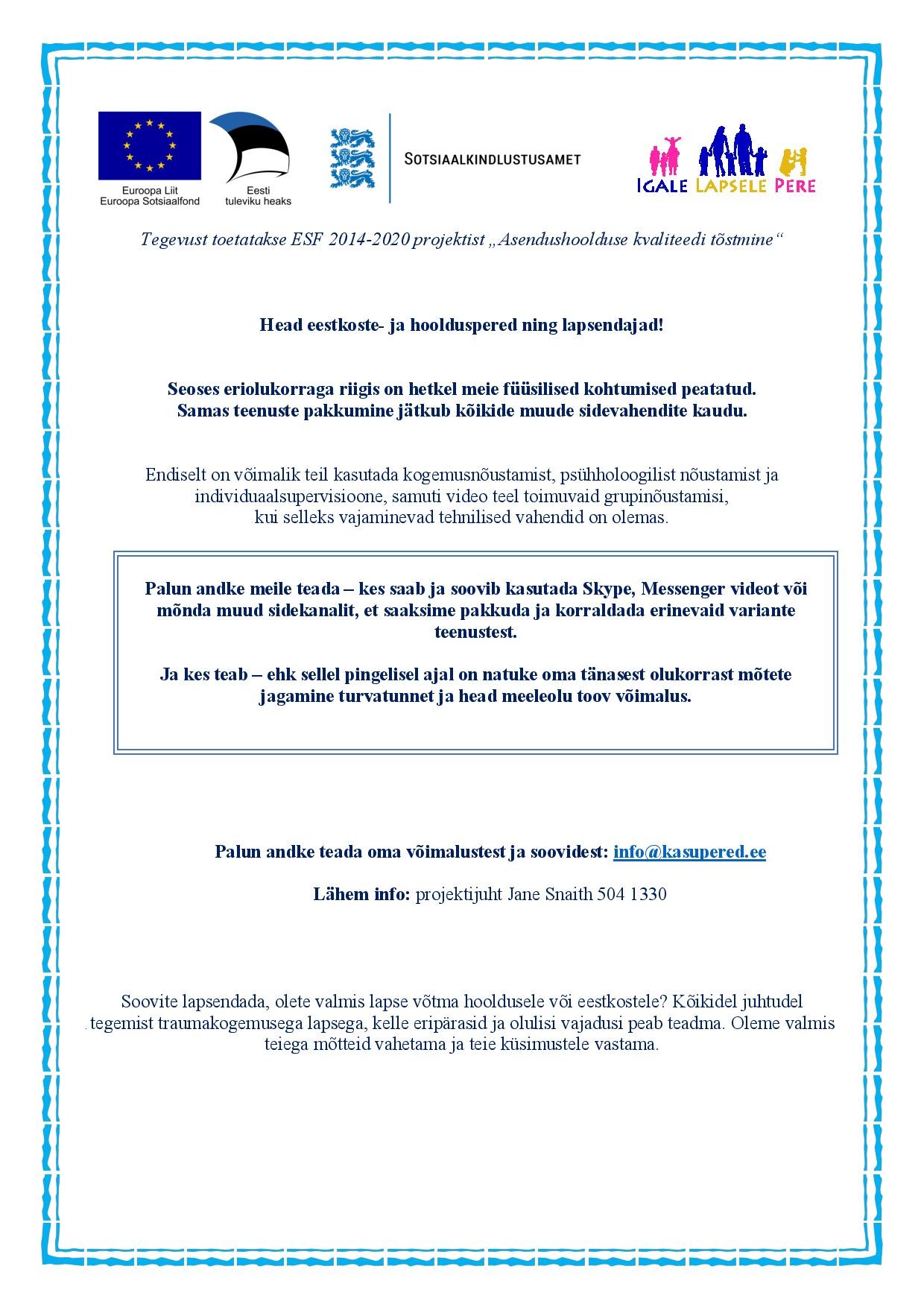 24. märtsil toimuma pidanud eestkoste- ja hooldusperede ning lapsendajaperede kohtumine jääb ära!
