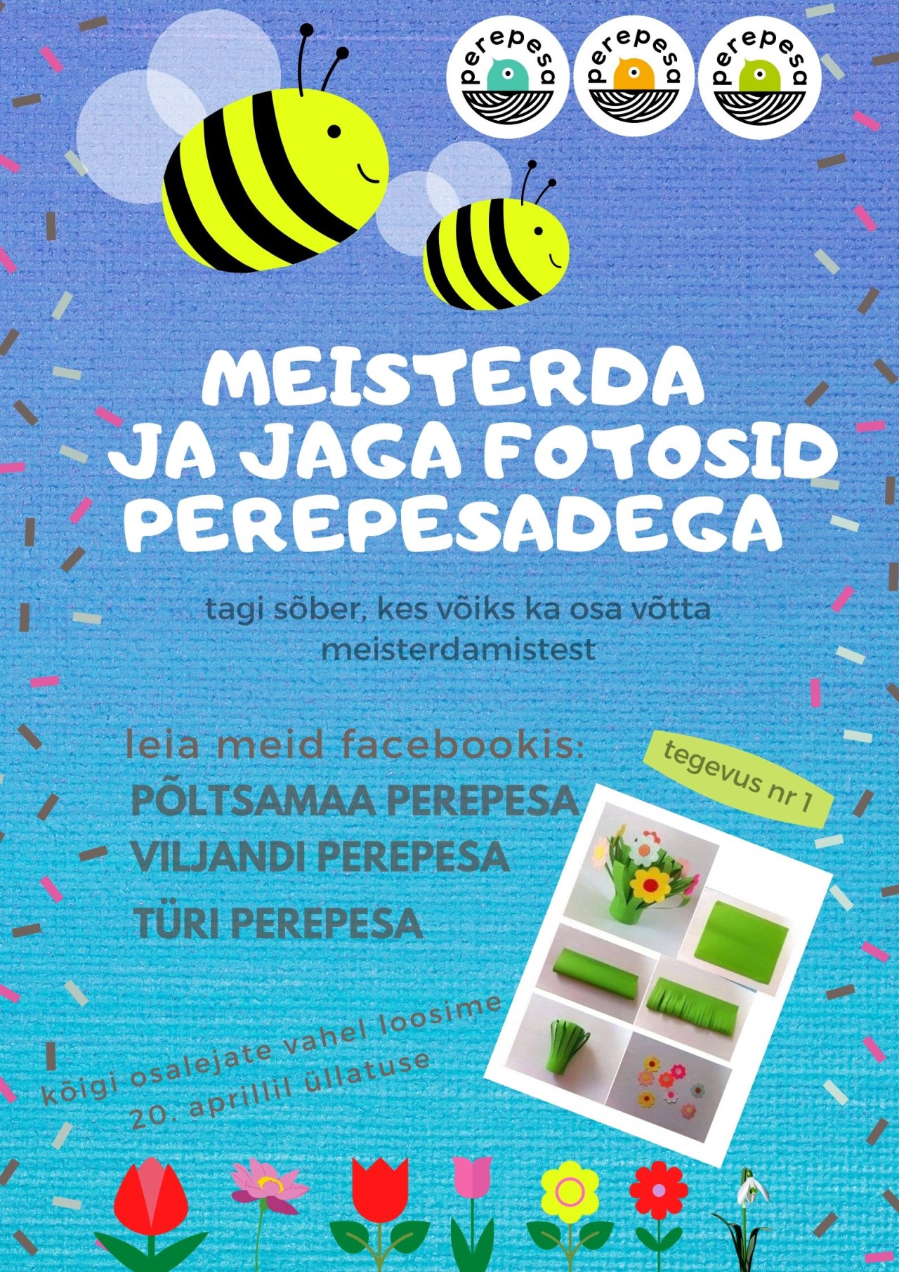 Pliks, plaks, läks! Kevad on käes ja Perepesad ühiselt kutsuvad kõiki peresid meisterdama. Alustame esimese tegevusega, milleks on kevadiste lillede meisterdamine.