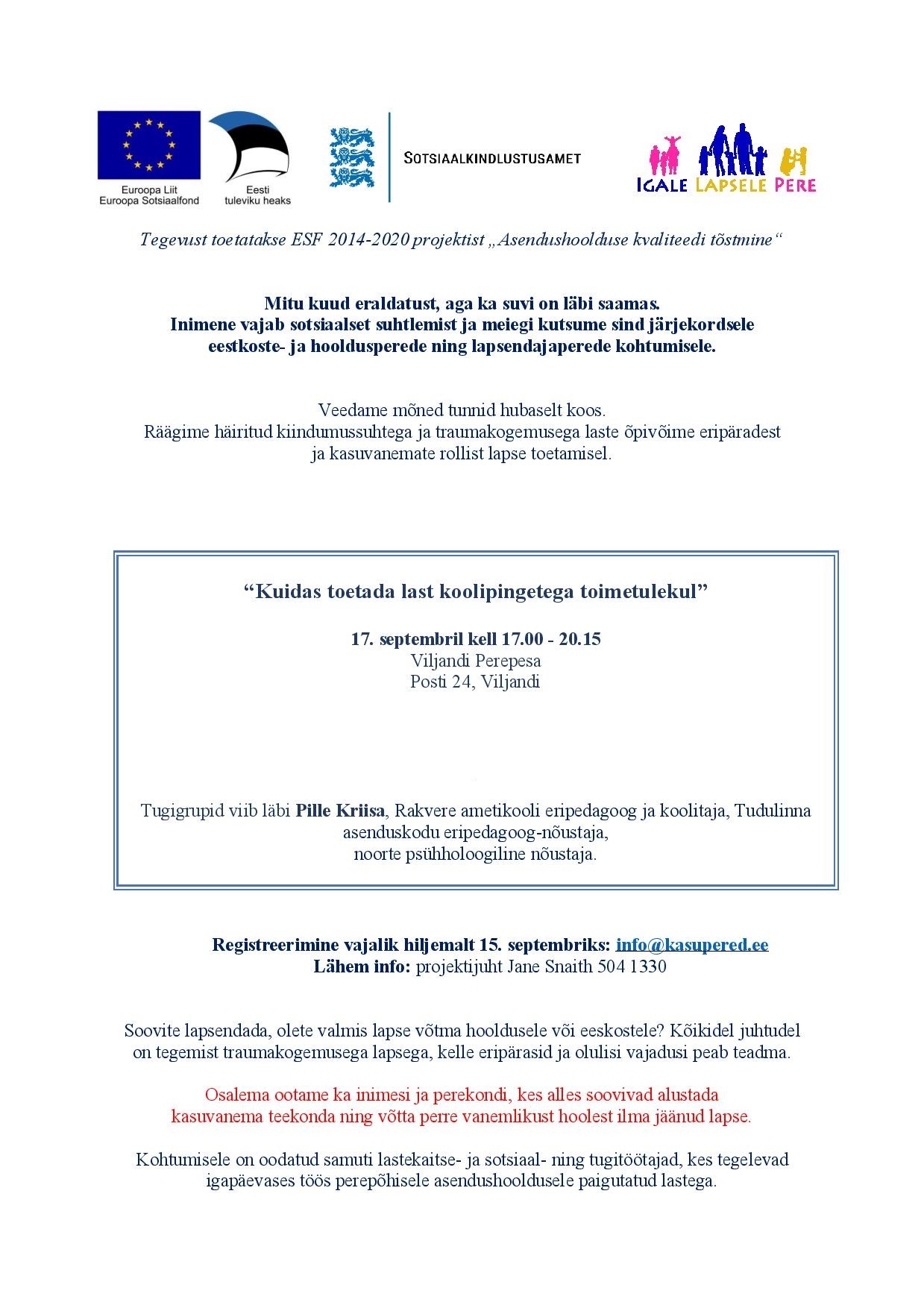 Eestkoste- ja hooldusperede ning lapsendajaperede kohtumine neljapäeval, 17. septembril kell 17.00-20.15