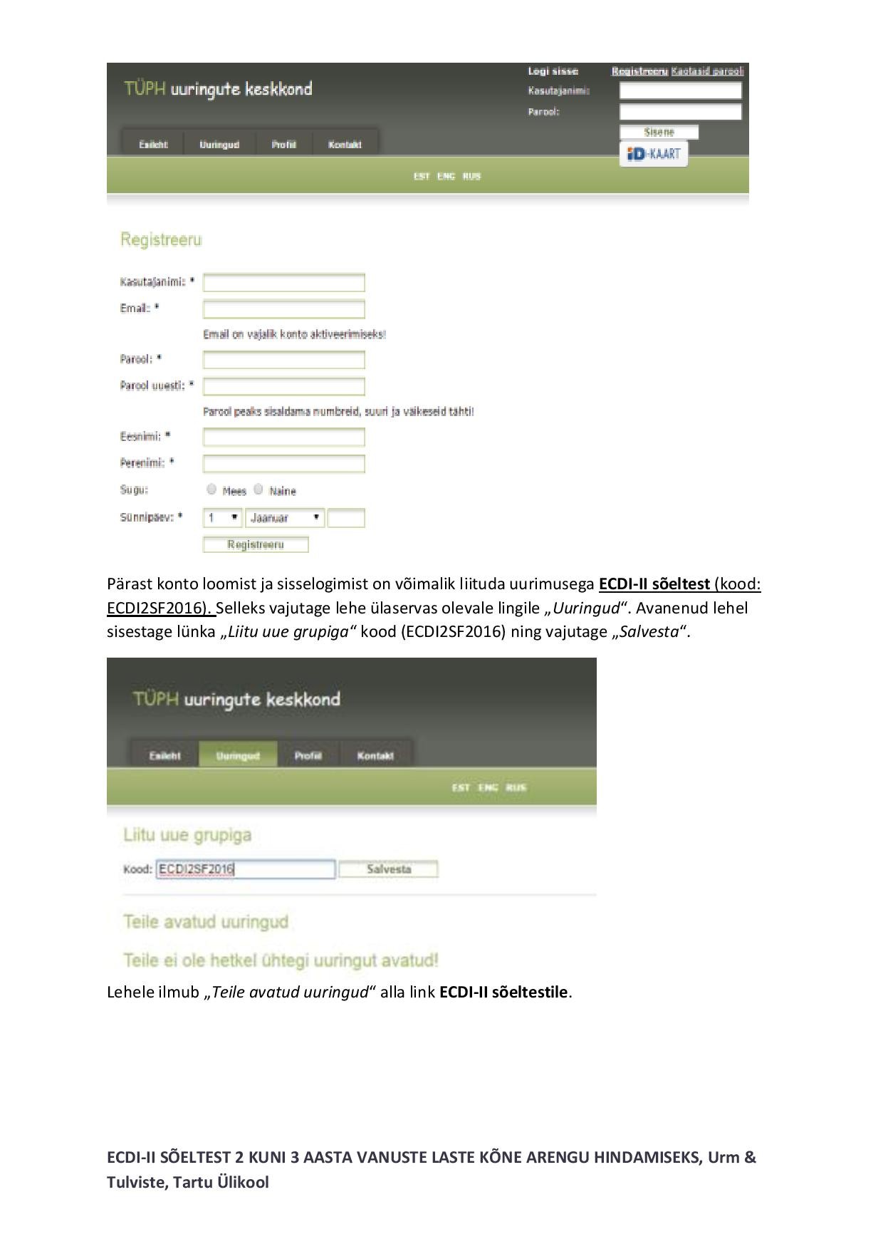 Testi täitmiseks internetis on tarvilik registreerimine portaali https://kaemus.psych.ut.ee/ kasutajaks. Registreerida saab nii ID-kaardiga kui ka ilma (lehe ülaservas link „Registreeru“). Vt juhendit allpool.