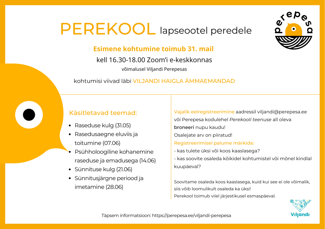 Vajalik eelregistreerimine aadressil viljandi@perepesa.ee või Perepesa kodulehel Perekooli teenuse all oleva broneeri nupu kaudu!