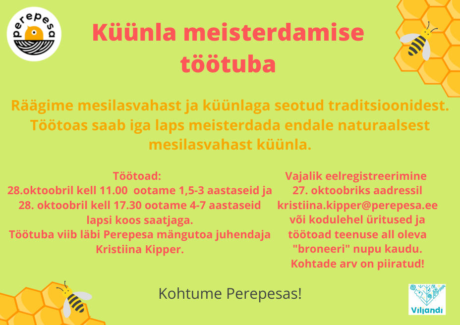 Viljandi Perepesas toimub 28. oktoobril küünla valmistamise töötuba, kus räägime traditsioonidest ja õpime valmistama küünalt. Töötuba viib läbi Perepesa mängutoa juhendaja Kristiina Kipper.