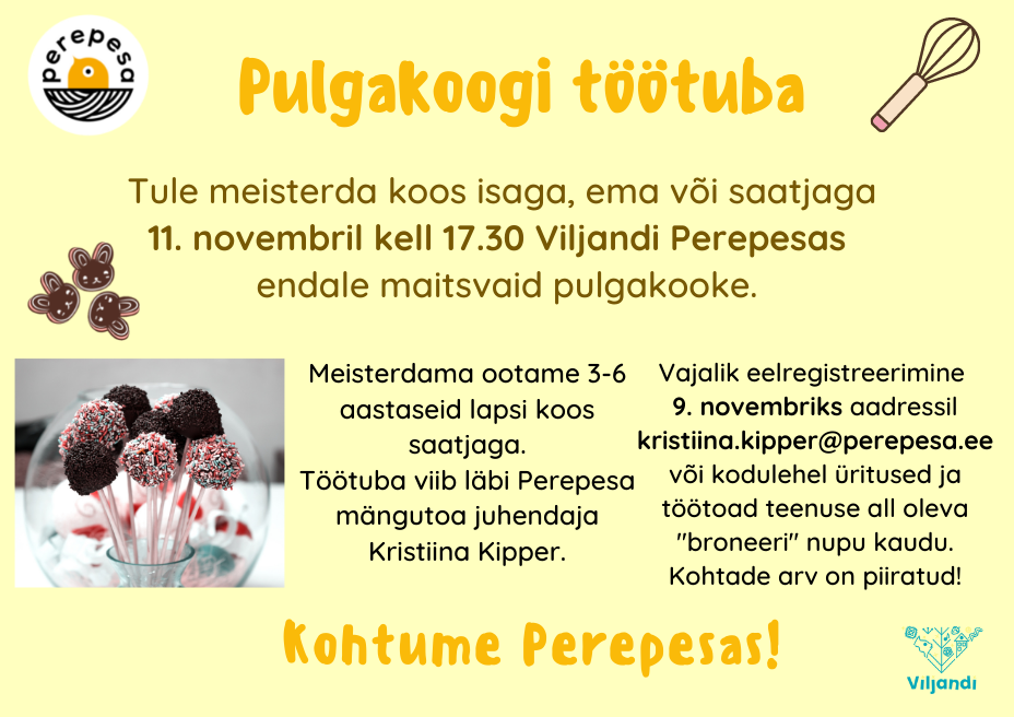 Viljandi Perepesas toimub 11. novembril kell 17.30 pulgakoogi meisterdamise töötuba, kus proovime teha erineva kujuga koogikesi. Töötuba viib läbi Perepesa mängutoa juhendaja Kristiina Kipper.