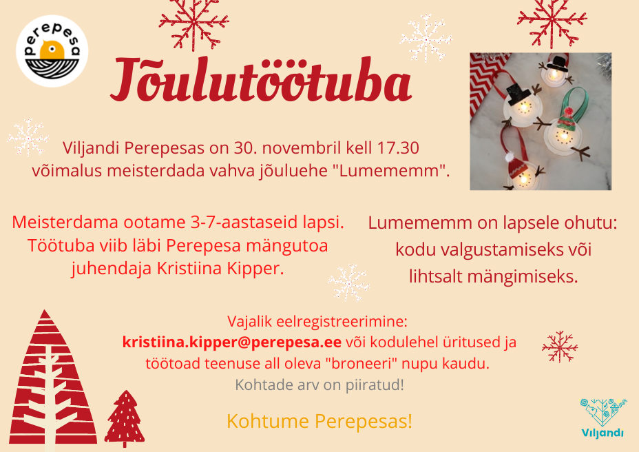 Viljandi Perepesas toimub 30. novembril kell 17.30 töötuba, kus meisterdame koos Perepesa väikeste sõpradega jõuluehet.