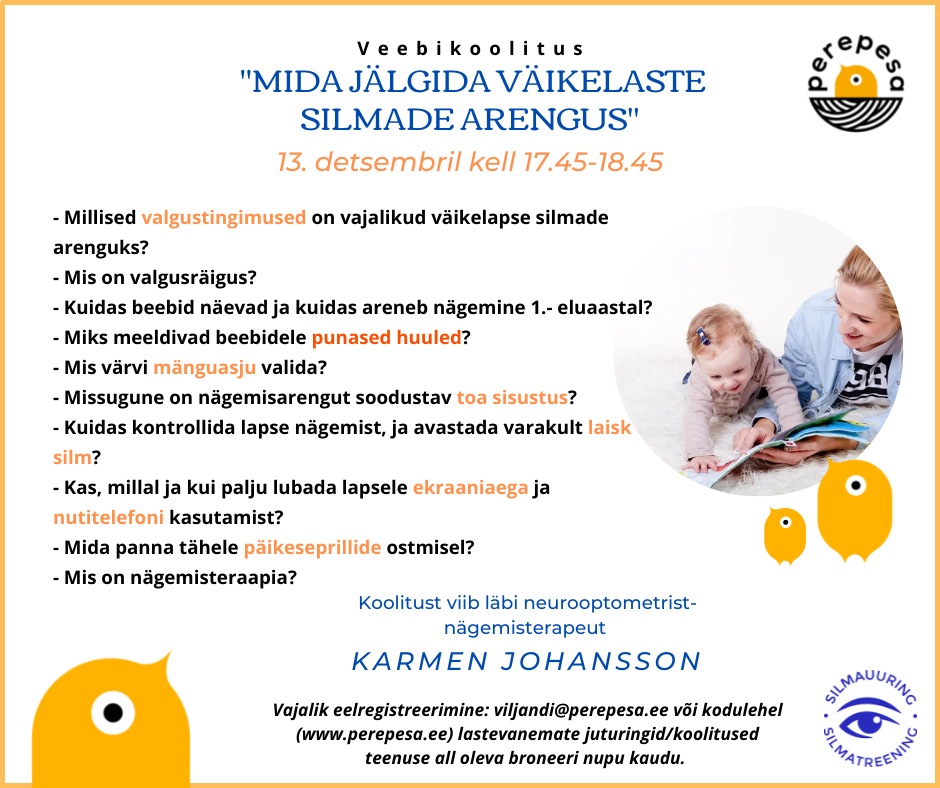 Koolitusele registreerimine: https://www.perepesa.ee/subservice/veebikoolitus-mida-jalgida-vaikelaste-silmade-arengus