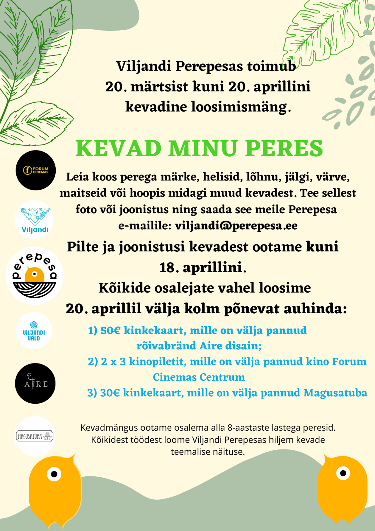 Selles osalemiseks naudi koos perega aega õues olles ning leia loodusest vähemalt üks kevade märk. Tee sellest foto või joonistus ning saada see hiljemalt 18. aprilliks meile: viljandi@perepesa.ee