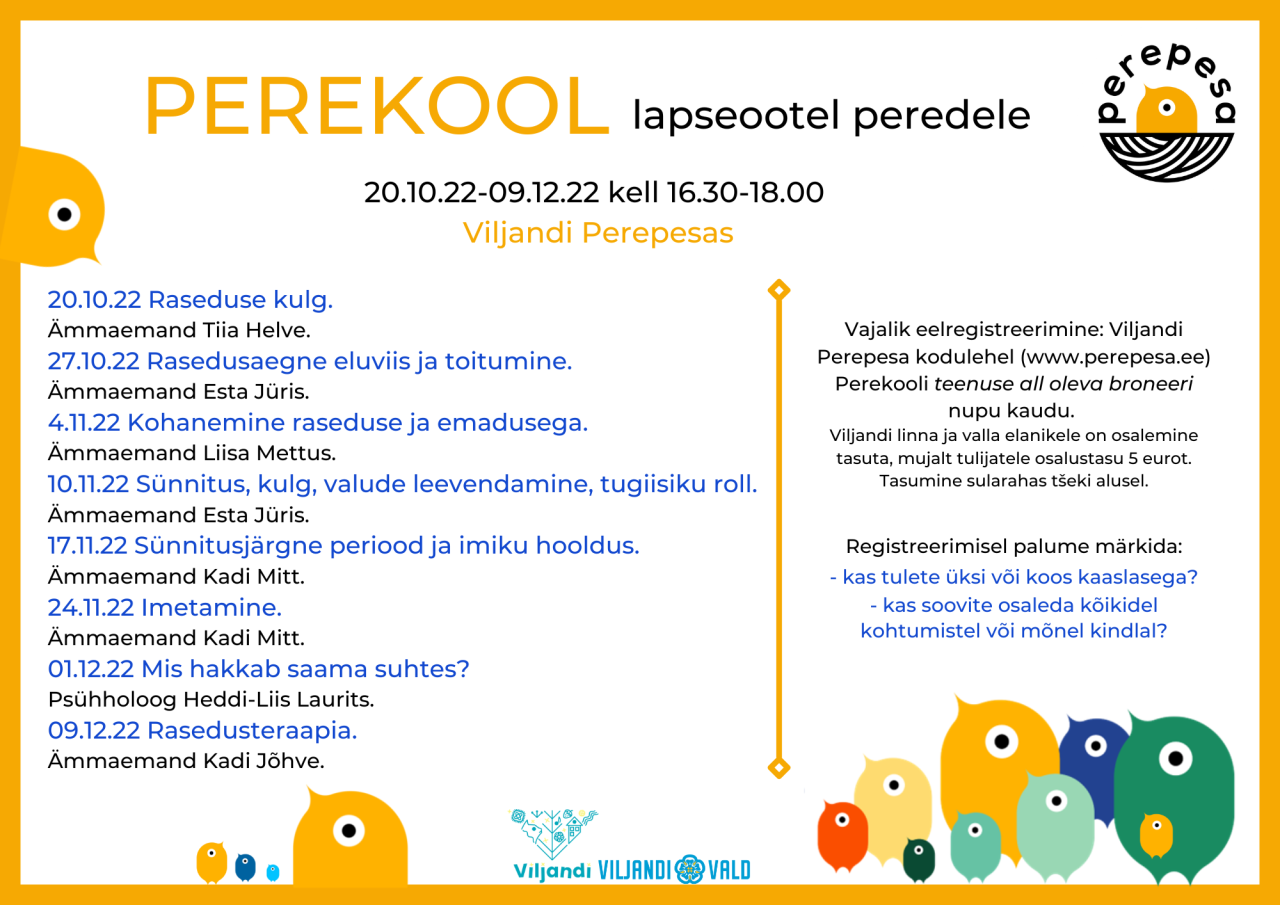 Vajalik eelregistreerimine: https://www.perepesa.ee/viljandi-perepesa/teenused/perekool