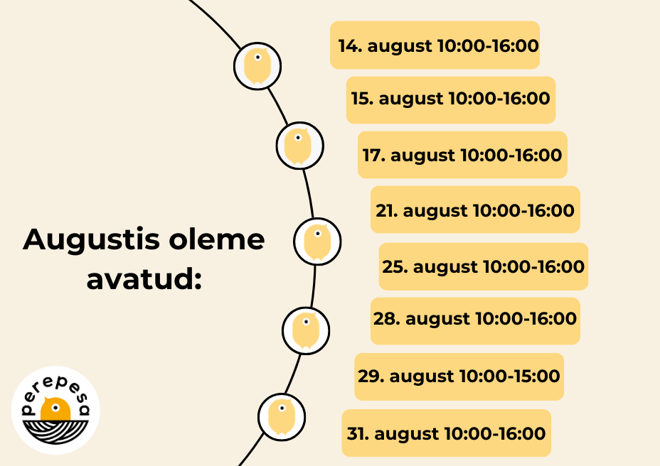 đ Augustis tegeleme iseenda tĂ€iendamisega ja Perepesa korrastamisega- seetĂ”ttu oleme avatud vaid kindlatel pĂ€evadel.