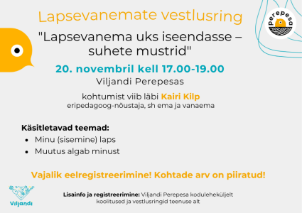 Vestlusring "Lapsevanema uks iseendasse" Vestlusring "Lapsevanema uks iseendasse" Struktuurse maali töötuba Värvidega mäng Lapsevanemate vestlusring "Lapsevanema uks iseendasse – suhete mustrid" Koolitus "Väikelaste emotsioonidega toimetulek" Leiva küpsetamine Viljandi haigla ja Perepesa lõid käed ühiste perekooli loengute korraldamiseks Tagasi 2 / 22 lehest (kokku 175 uudist) Edasi