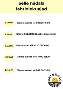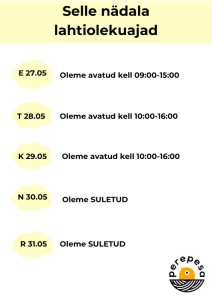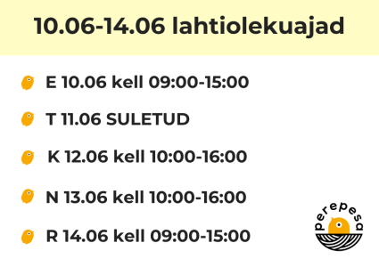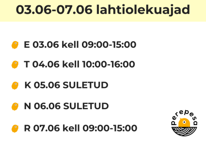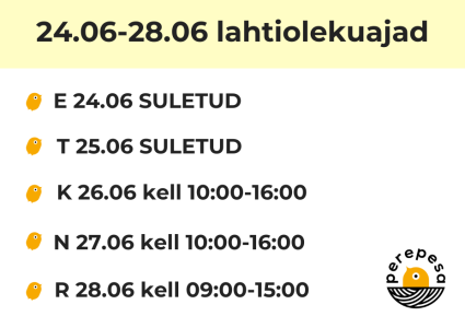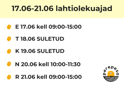 Perepesa puhkab juulikuus! 24.06-28.06 lahtiolekuajad 17.06-21.06 lahtiolekuajad 10.06-14.06 lahtiolekuajad 03.06-07.06 lahtiolekuajad 27.05-31.05 lahtiolekuajad 20.05-24.05 lahtiolekuajad 22.04-27.04 lahtiolekuajad Tagasi 5 / 22 lehest (kokku 175 uudist) Edasi
