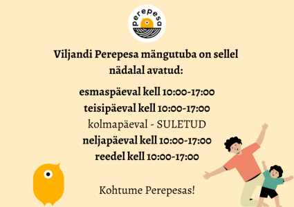 Alustab lapse ja vanema loovusring Ootame kõiki mängima! Muusikatunnid Viljandi Perepesas! Ootame mängima! Lugemiseks Viljandi Perepesas 28.03-01.04 Perepesa avatud: Kevade detektiivid Mängutuba sellel nädalal avatud... Tagasi 9 / 22 lehest (kokku 175 uudist) Edasi